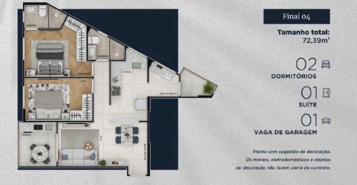 Apartamentos de 02 dormitórios sendo 01 suíte com 72,39 m² e 01 vaga de garagem.